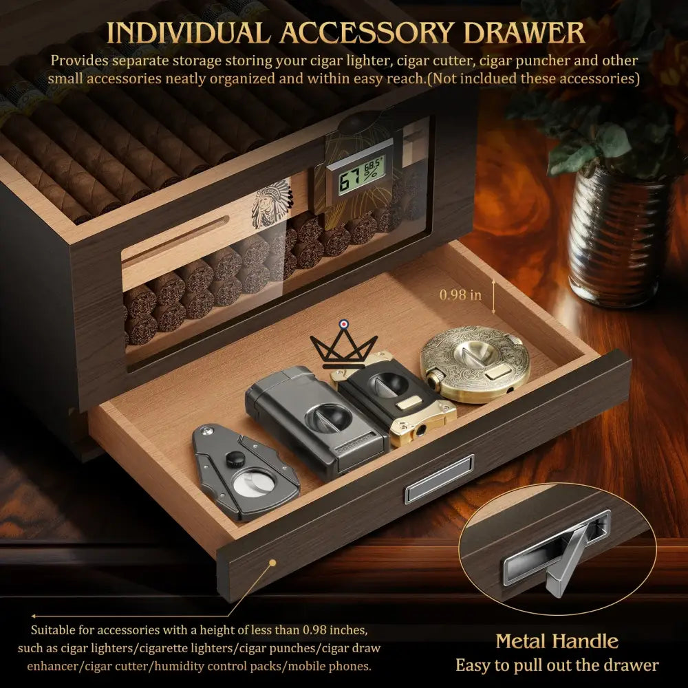 With its fine wood construction and glass lid, this humidor combines high-end aesthetics with immediate visibility of your collection. The main compartment holds up to 80 cigars , distributed between a large lower space and a removable upper tray with optimized ventilation slots.